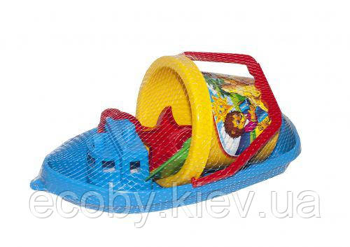 Комплектація: Кораблик, відро, лопатка, граблі, 2 пасочки