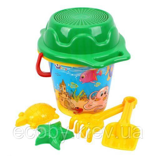 Іграшка "Набір пісочний ТехноК" — відро, лопатка, граблі, сито 2 формочки
